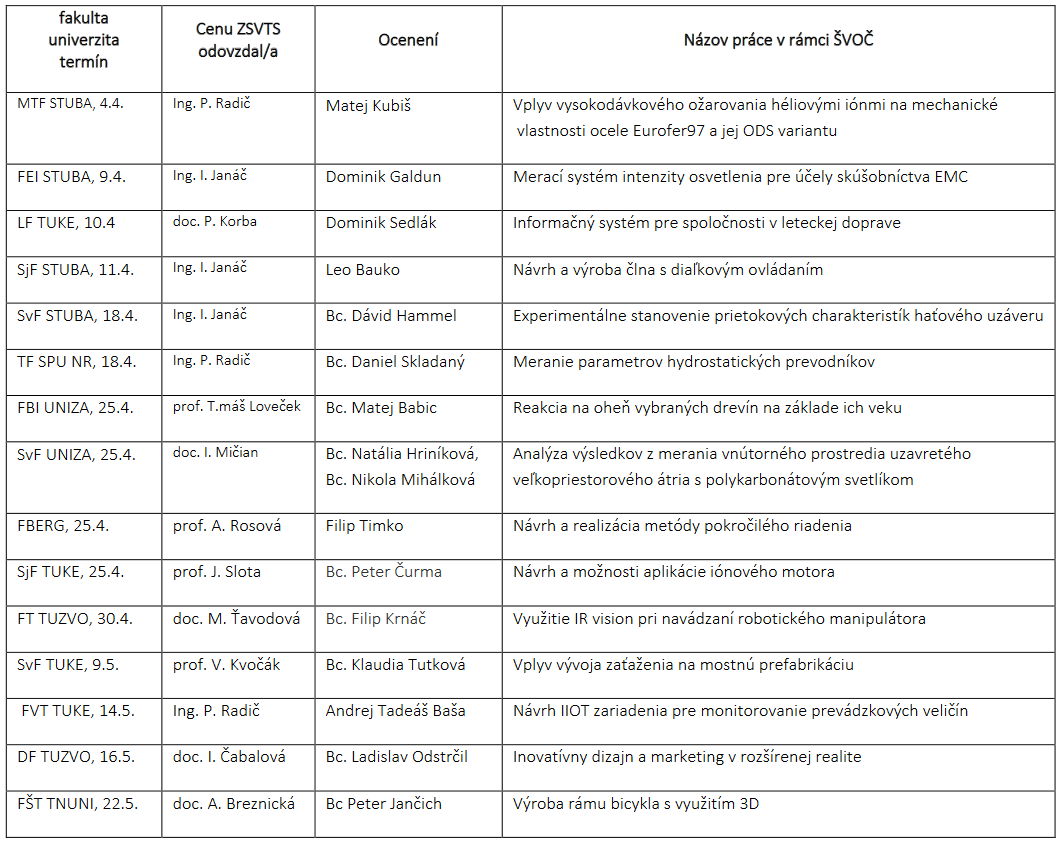 Zväz slovenských vedeckotechnických spoločností (ZSVTS) už ôsmy rok odovzdáva Cenu ZSVTS za Študentskú vedeckú a odbornú činnosť (ŠVOČ) študentom na slovenských technických univerzitách.