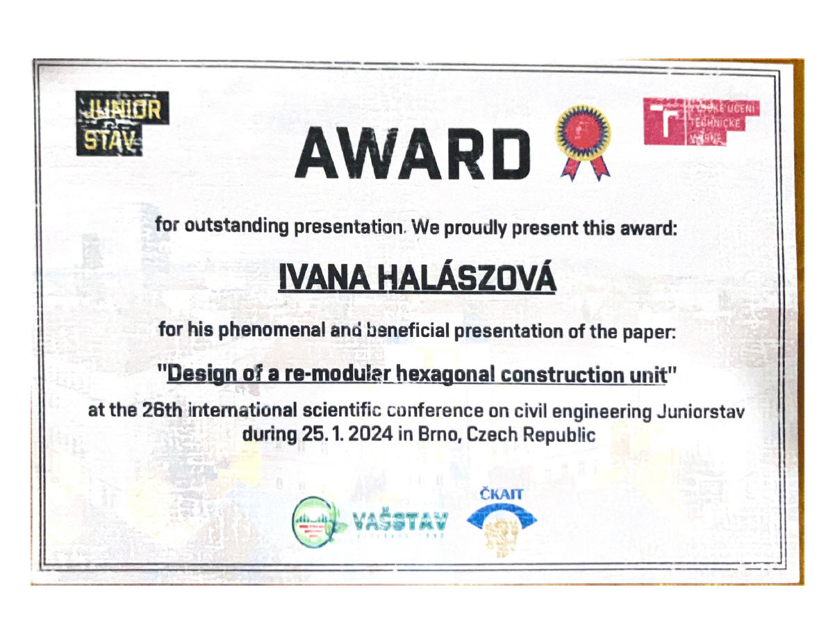 JUNIORSTAV 2024 – ocenenie príspevku „Design of re-modular hexagonal construction unit“ za prínosnú prezentáciu v sekcii – Ing. Ivana Halászová