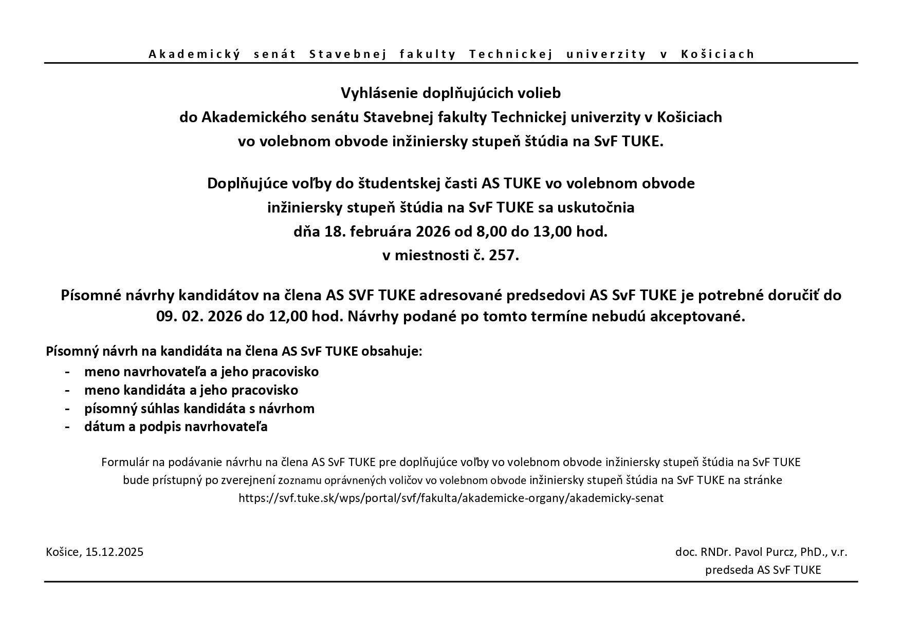 Vyhlásenie doplňujúcich volieb do AS SvF TUKE vo volebnom obvode inžiniersky stupeň štúdia na SvF TUKE